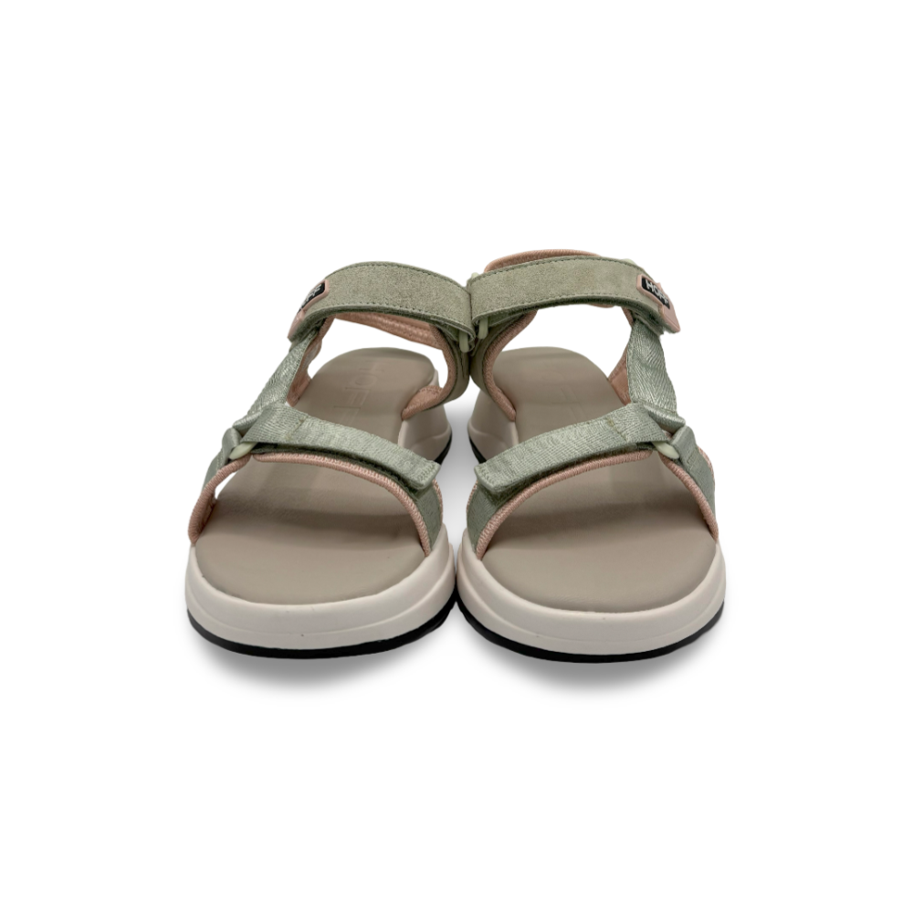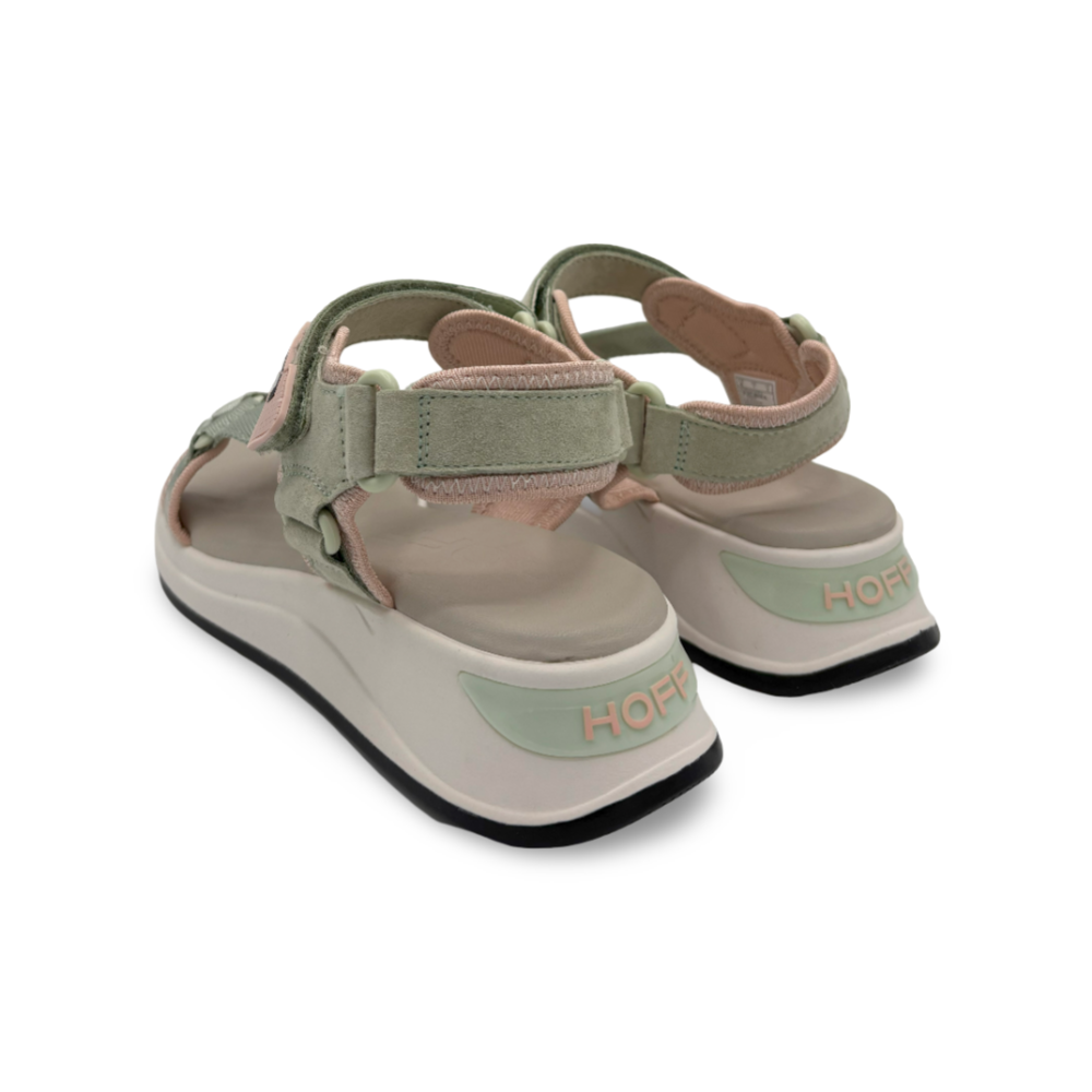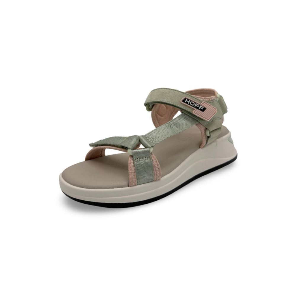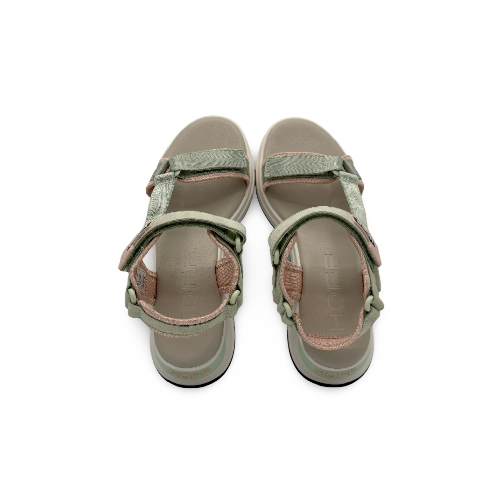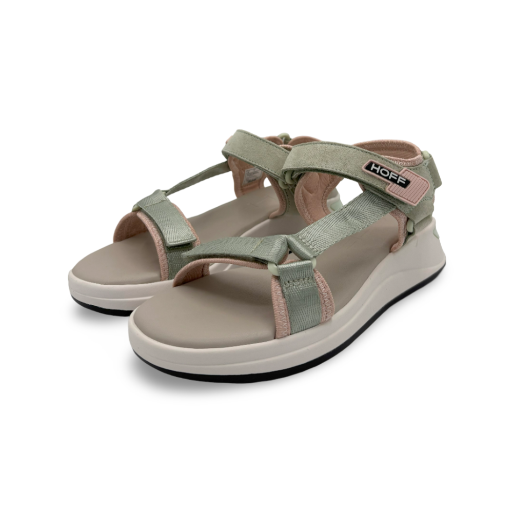 Descubre la comodidad y estilo deportivo de las nuevas sandalias planas HOFF modelo BARROW para mujer. Su diseño combina tiras anchas en tonos verde pastel y rosa empolvado, aportando un aire fresco y juvenil a tus looks de verano.