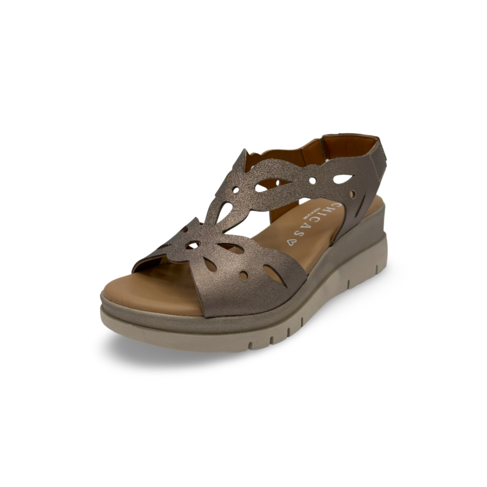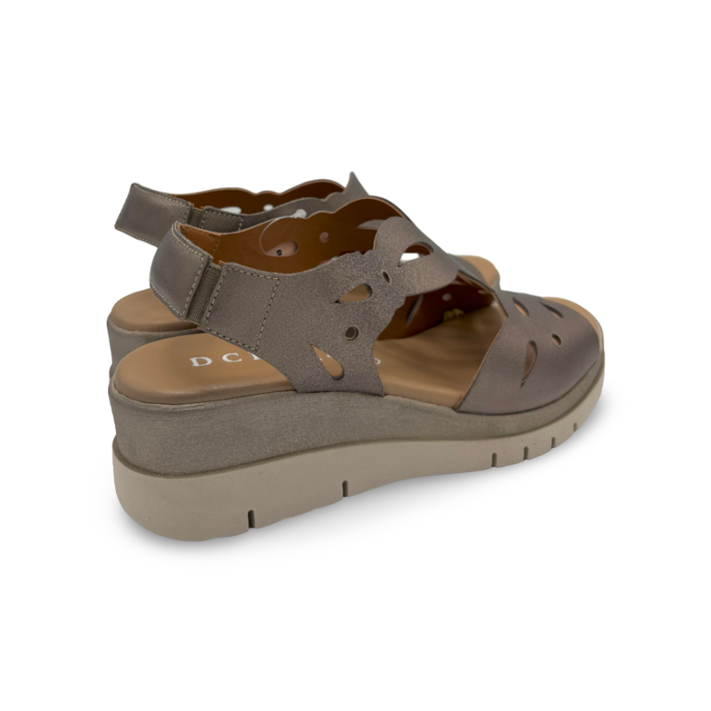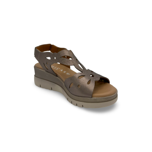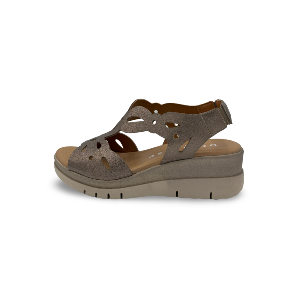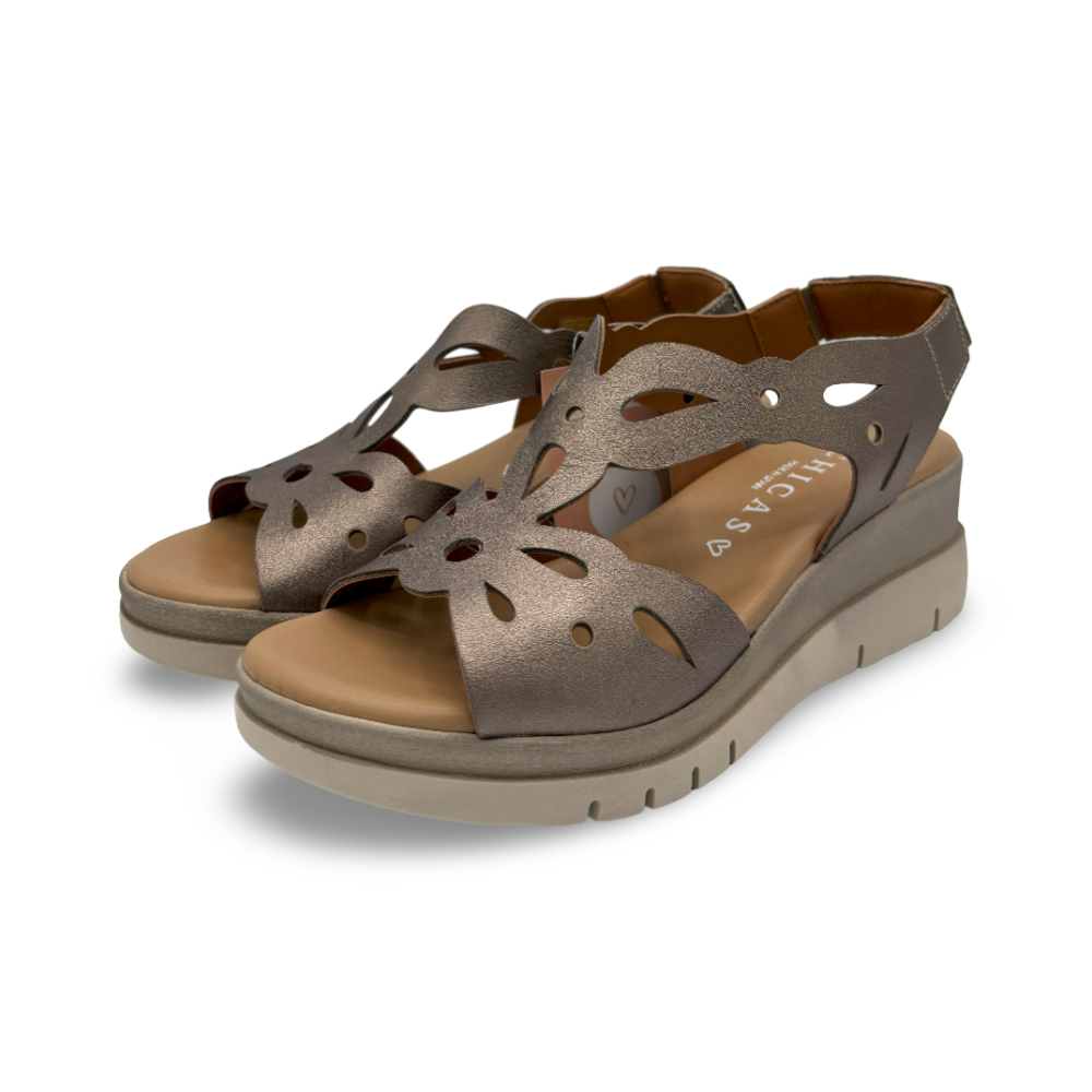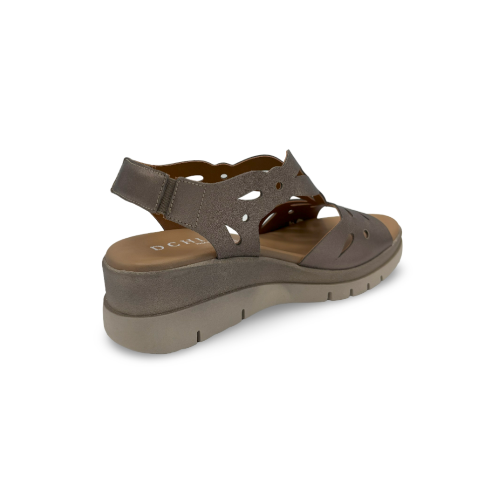 Sandalia cómoda metalizada con cuña que combina diseño actual y confort. Fabricada en material metalizado de tono bronce, luce un elegante corte troquelado que aporta estilo y ligereza. Su cuña ligera, de altura media, proporciona estabilidad y comodidad, ideal para uso diario o para dar un toque chic a tus looks de verano. El cierre con velcro facilita un ajuste perfecto y rápido.
