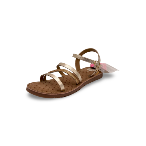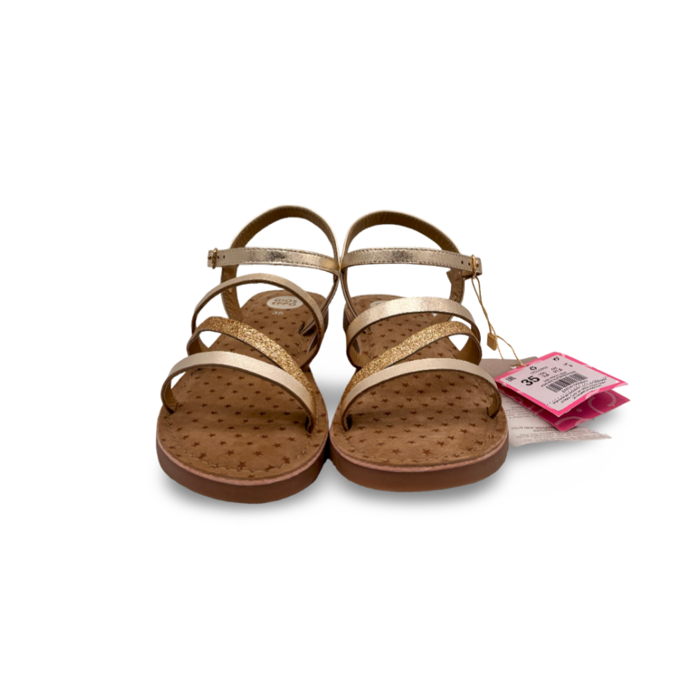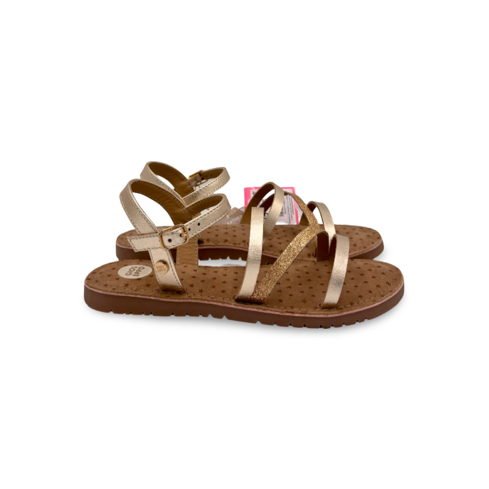 Brillo y comodidad para las más peques con esta preciosa sandalia de Gioseppo. Diseñada en color dorado metalizado, su estructura de tiras finas cruzadas aporta un toque elegante y actual, perfecta para lucir tanto en el día a día como en ocasiones especiales.