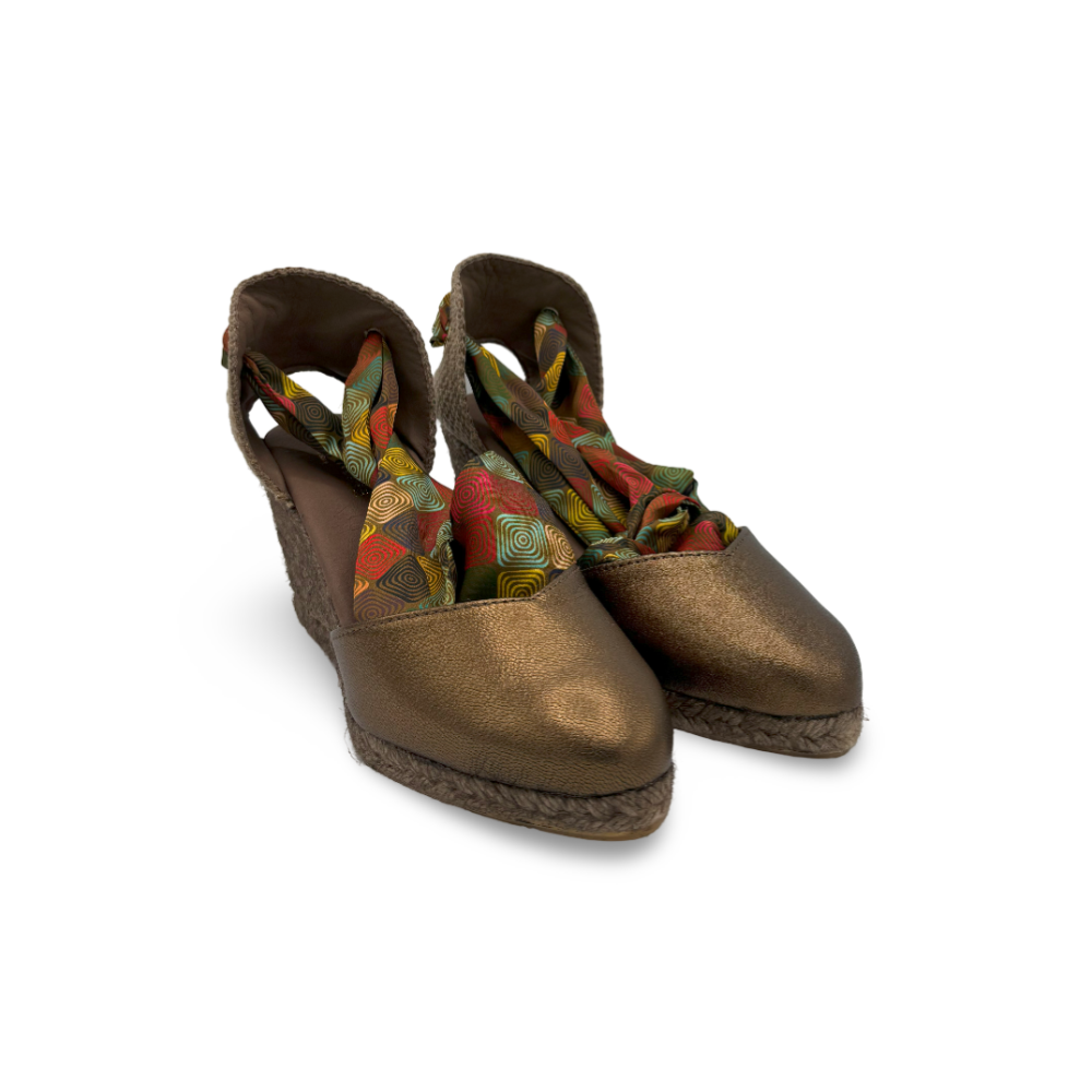 ¡Atrévete a brillar! Estas preciosas cuñas de esparto en color bronce de LA VALETA aportan un toque de luz y originalidad a tus looks. Su diseño con pañuelo estampado, pensado para anudarse alrededor del tobillo, ofrece sujeción y un estilo único.