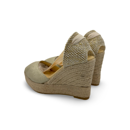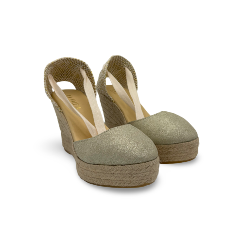 En Mesa Calzados, te presentamos estas elegantes cuñas de la marca LA VALETA, confeccionadas en tejido brillante color dorado que aporta un toque sofisticado a cualquier look. Su diseño con cintas para atar al tobillo y cuña forrada en yute las convierte en el calzado perfecto para combinar con vestidos veraniegos, looks de fiesta o incluso estilismos más casuales.