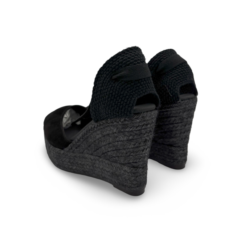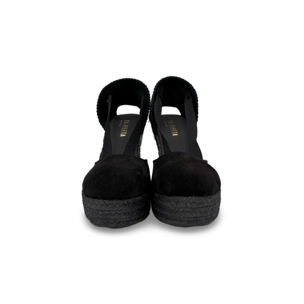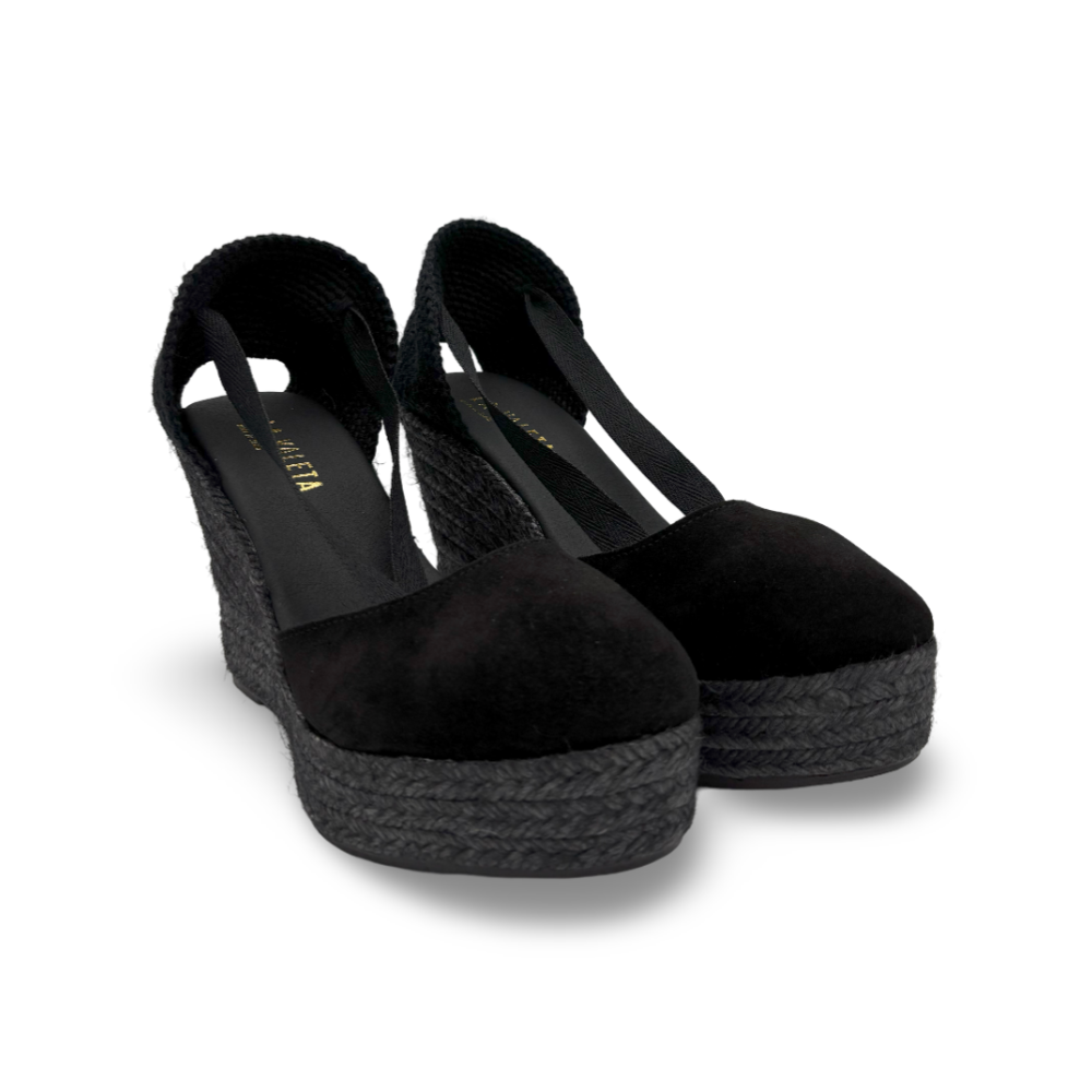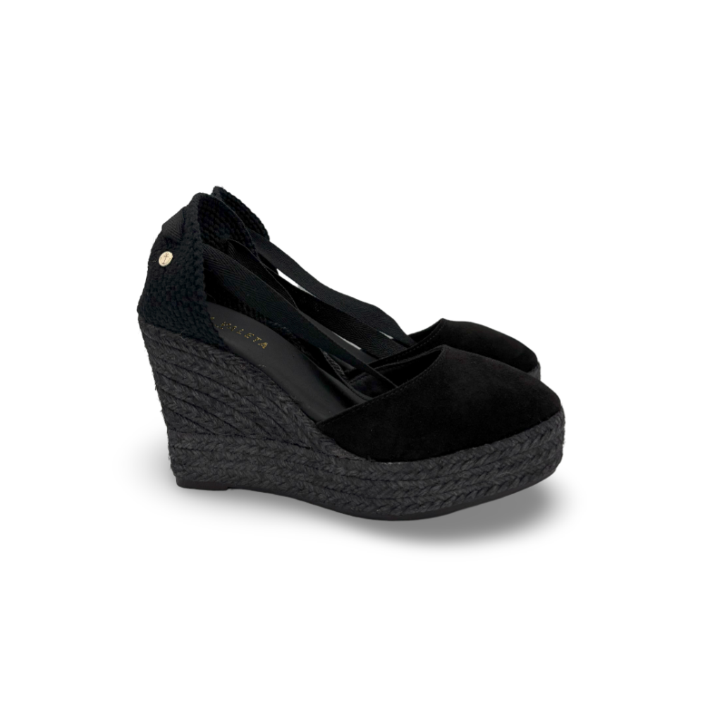La cuña está forrada en yute teñido en negro, aportando un toque sofisticado y moderno, mientras que la suela de goma garantiza ligereza y seguridad al caminar. Su plantilla acolchada proporciona confort incluso en los días más largos.