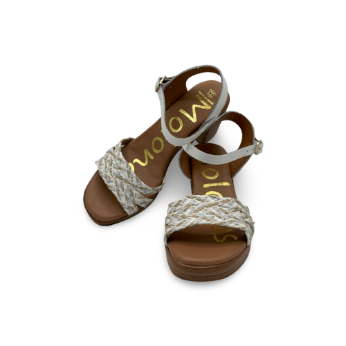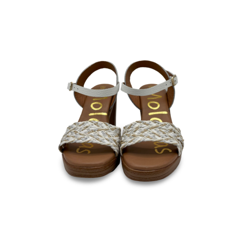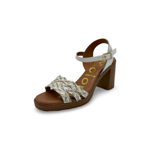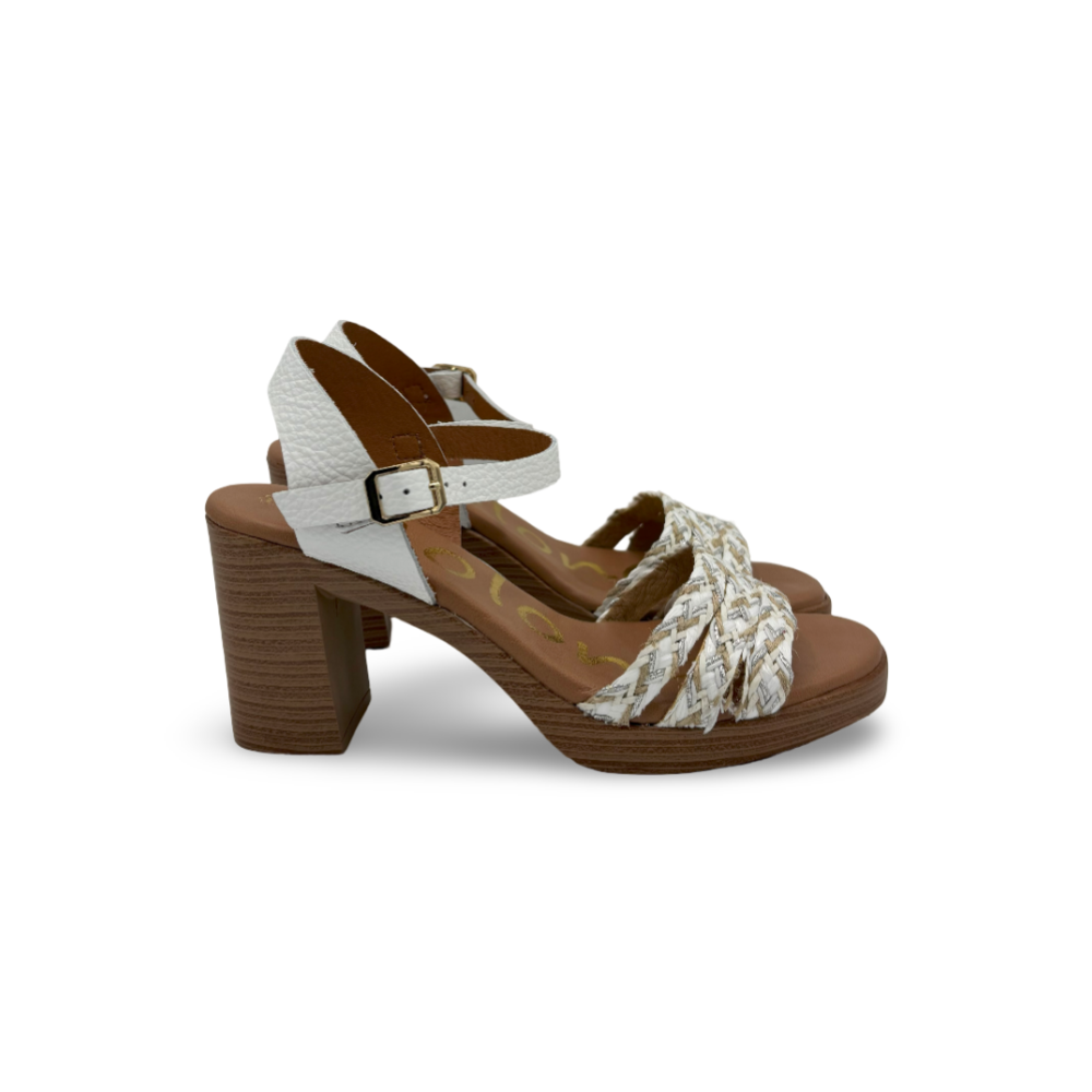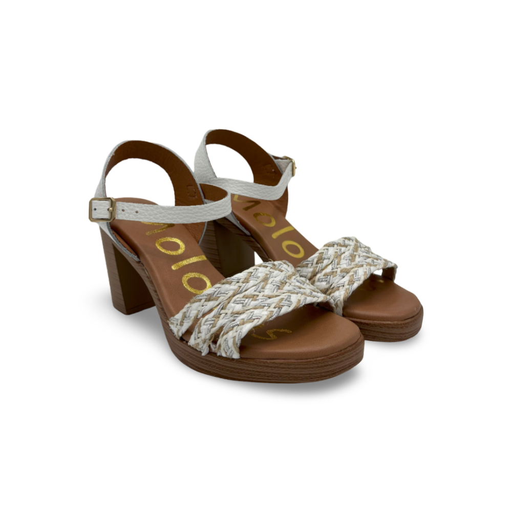 La sandalia de tacón para mujer de MOLONAS es una apuesta segura para quienes buscan estilo, frescura y estabilidad en cada paso. Con un diseño moderno que mezcla piel blanca grabada y textil trenzado en tonos naturales, esta sandalia resalta por su carácter artesanal y elegante.