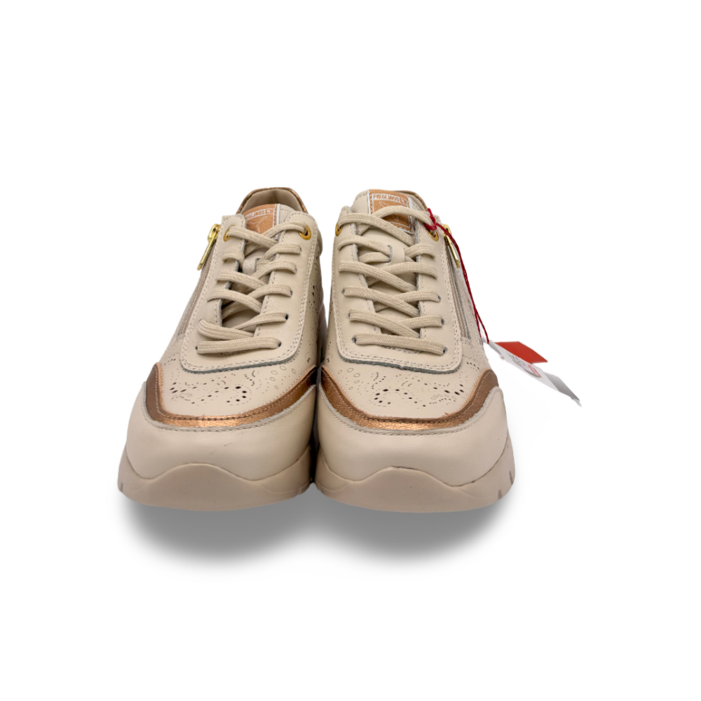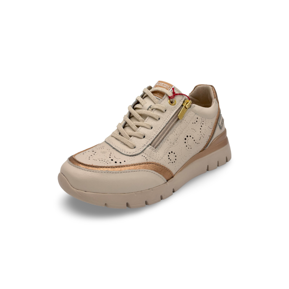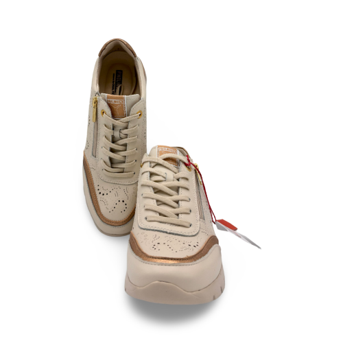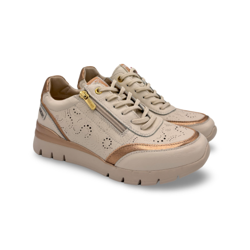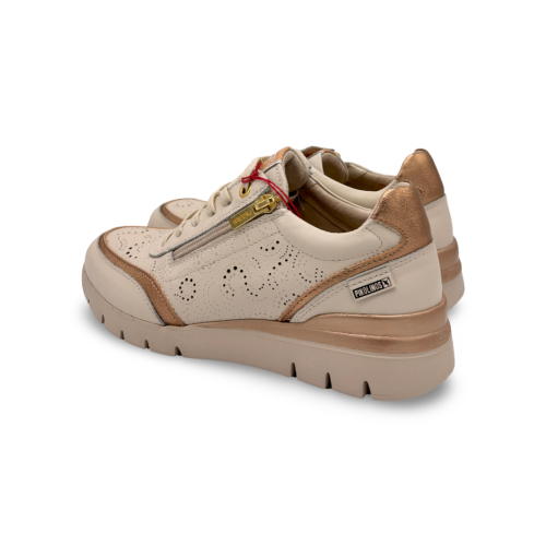 En Mesa Calzados te presentamos esta deportiva de Pikolinos, elaborada en piel beige con detalles metalizados en tono cobre, perfecta para añadir un punto sofisticado a tus looks casuales. Su diseño perforado no solo aporta un estilo único, sino que garantiza una excelente transpirabilidad.