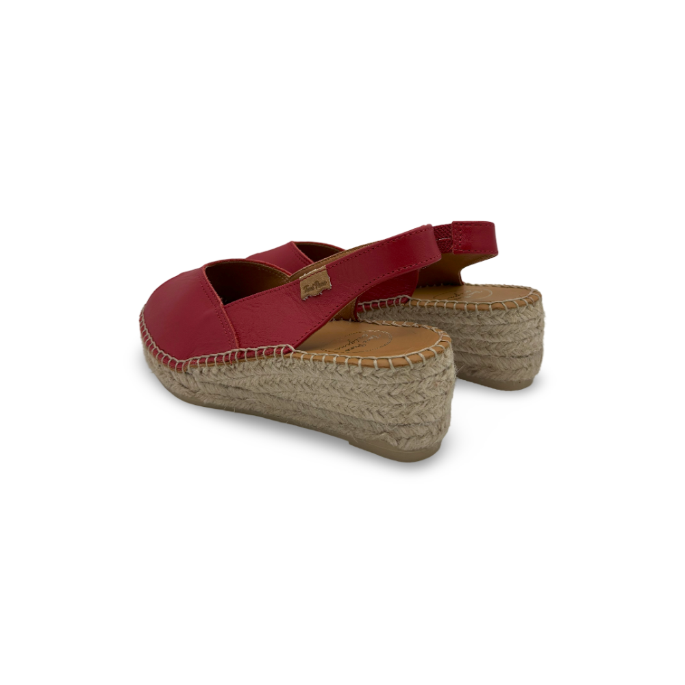 Su cuña de esparto aporta altura y un aire veraniego, mientras que la suela de goma antideslizante garantiza seguridad y confort en cada paso. Ideales para pasear por la ciudad, salir a cenar o disfrutar de eventos especiales, estas cuñas elevan cualquier look gracias a su intenso color rojo y a sus acabados artesanales.