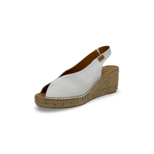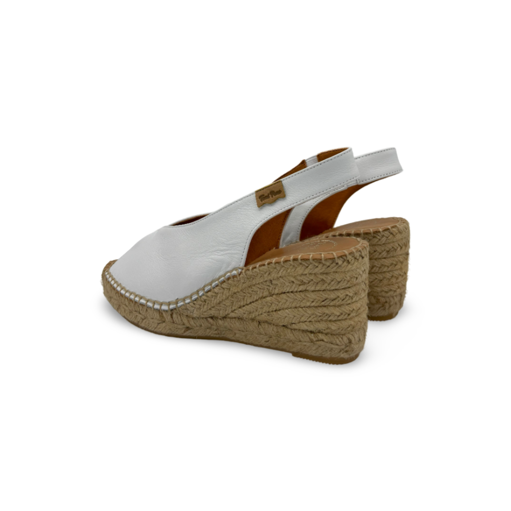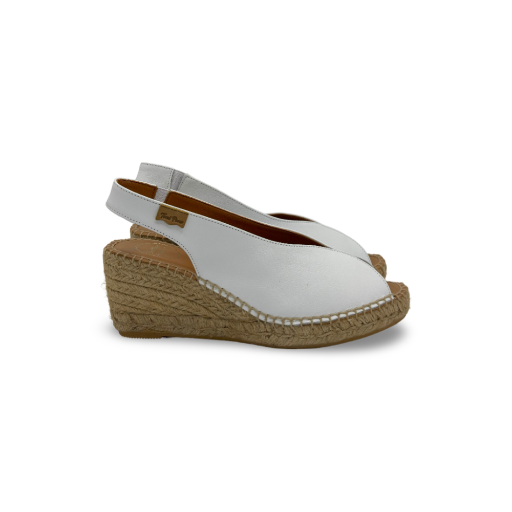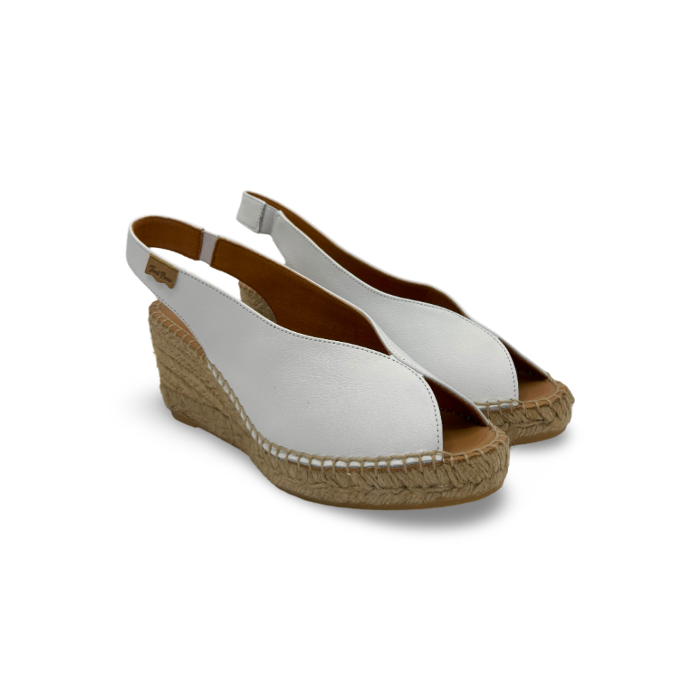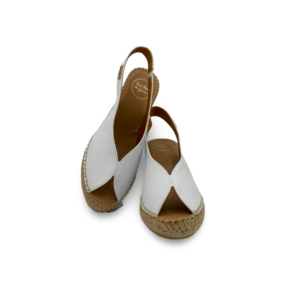 En Mesa Calzados, tu zapatería de confianza en Montoro, te presentamos esta elegante sandalia cuña de esparto en color blanco de Toni Pons, pensada para mujeres que buscan estilo y comodidad en su día a día.